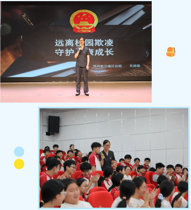 航空港区实验学校法治副校长、法院干警吴琼琼为同学们带来了精彩的“开学第一堂法治课”。她针对青春期的生理和心理特点,结合与同学们生活、学习等密切相关的预防校园欺凌这一话题,通过一个个真实的案例,生动地为同学们讲解了校园欺凌的表现形式、危害后果和法律责任等,同时给出了防范校园欺凌建议。