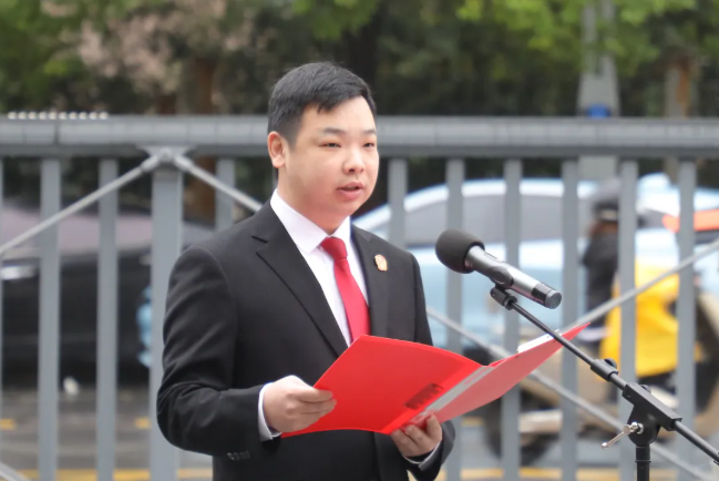 在五星红旗的见证下,青年法官吴迎晖代表全体干警郑重承诺:“猎猎飘扬的五星红旗,既是祖国繁荣的见证,也是我们冲刺奋进的号角。我们将把对祖国的热爱,转化为攻坚克难的强大动力,以公正司法捍卫公平正义,用实干担当书写法治新篇,为祖国的繁荣富强提供坚强司法保障!”