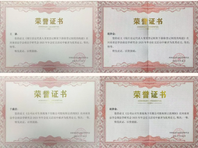 近日,河南省法学会商法学研究会2025年年会征文评选结果揭晓,郑州航空港区法院司法调研再结硕果,其中,王谦、赵妙金同志撰写论文《现行法定代表人变更登记框架下涤除登记制度的构建》喜获特等奖,于鑫波、赵妙金同志撰写论文《公司认可生效视角下有限公司股权转让的规制》喜获一等奖。