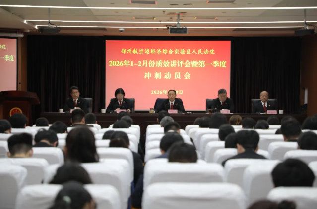 为深入贯彻近期上级有关部署,及时总结年初以来工作情况,全力推动一季度重点工作落地见效,3月9日,郑州航空港区法院召开2026年1-2月份质效讲评会暨第一季度冲刺动员会。会议由分党组成员、副院长王东主持,全体干警参会。
